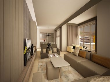 الصالة : الردهة الرئيسية مفروشة بأرضيات باركيه طبقي خشبية مع سقف معلق ديكور زخرفي، مطعمة بوحدات سبوتات إضاءة مع خطوط مخارج تلفزيون وهاتف وخط مقبس كهربي.