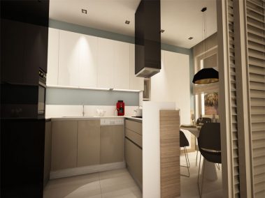 المطبخ : سيراميك أرضيات من الجرانيت، سقف معلق، مطعمة بوحدات سبوتات إضاءة مع خطوط مخارج تلفزيون وهاتف وخط مقبس كهربي، خزائن جاهزة للمطبخ مع ملحقات داخلية للخزانة، حوض مواعين من الصلب مزدوج الخانة، بالإضافة لشفاط وموقد كهربائي مدمج وفرن مدمج.