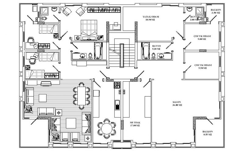 - Salon: zemin laminate parke, dekoratif asma tavan, tavandan spot aydınlatma tesisatı, tv, tlf ve priz hattı