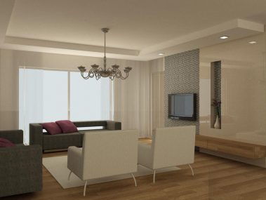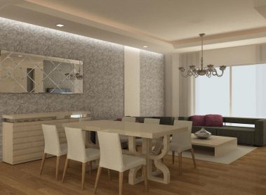 - Гостиная: ламинатные полы, декоративный подвесной потолок, потолочное точечное освещение, телевизионная, телефонная и электрическая разводка